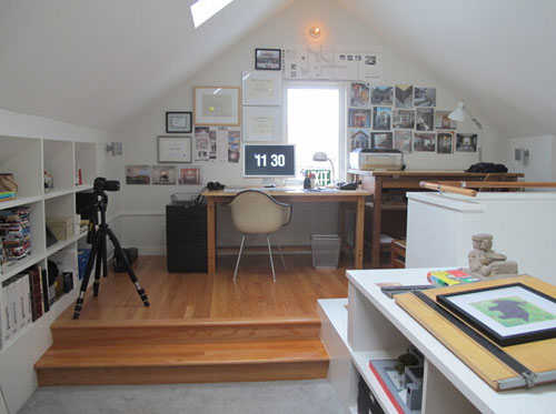 小编的话:利用阁楼空间来作为书房,墙面上大小不一的画框突显出整个墙面的装饰感。