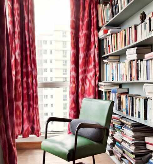 小编的话:左右两边完全用两扇大大的落地窗取代了墙面,让整个空间都暴露在了阳光和自然之中。如果家中的空间比较紧张的话不妨在墙面上设置几块隔板,做成简易书架。这样在节省空间的同时也方便拿取。