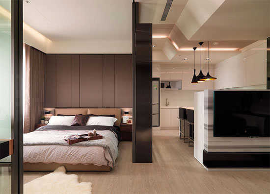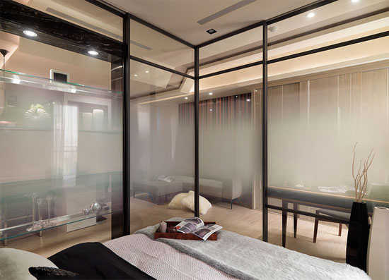 小编的话:黑框玻璃组成的卧室隔断,从卧室里看出要比从外面看进来显得更显通透,移门的设计让这间卧室既保有了私密性,又能够在平日里显现出开放式的格局。