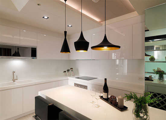 小编的话:厨房区域以纯白色系打造,实用的吧台与L形烹饪区的组合,使这一厨房区域在实用的基础上还十分美观。吧台上方造型完全不同三盏吊灯为这一区域看上去显得灵动且具设计感,而暖色调灯光则让房主在这边用餐之余能够感受到更多的家的温馨。