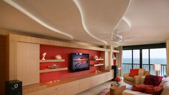 电视背景墙的设计足足横跨了整个客厅墙壁,底部为一长排收纳柜,而中间部通过搁板将艺术装饰品予以展示,红色的背景色很好的配合了整体空间用色。顶部类似梯田的吊顶,给客厅增添了鲜明的层次感。