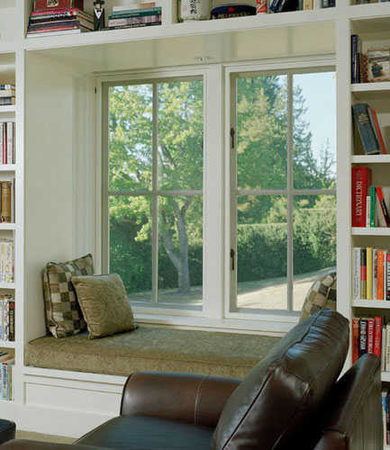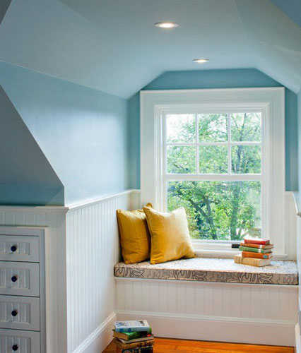 楼梯转角处也常常有这样一个小窗体,透过窗体往往有十分美丽的风景,而这个区域其实有着较为宽敞的空间,必须好好利用一番,这个案例,紧贴窗边被设计成了舒适的沙发座椅,而一侧的墙体被设计成了书架,也是一个很好的阅读区。