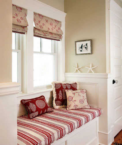 虽然没有精雕细琢的抢眼设计,但这款飘窗一切都因其舒适取胜。利用足够突兀的飘窗区域,设计足够宽敞的休息平台,以宽敞的条纹床垫铺满,加上合适用色的靠包,让人尽情享受角落那份明朗的舒适。