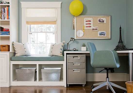 不规则的墙体下方,也是飘窗的位置,这里因为空间的原因,飘窗周围以及下方,都摒弃了收纳功能。只是用方形飘窗垫来做空间装饰,再添置几方小抱枕,安静独立的读书角算是打造完毕。
