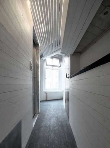 小编的话:把玄关打造成纯白色木质墙壁,包括天花板也是木质长条聚集而成,只有地板是深咖啡色,与其他部分的白形成了鲜明的对比。
