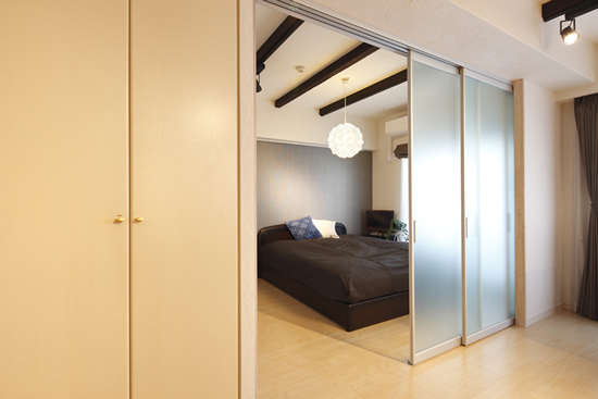磨砂的玻璃拉门,不仅起到了隔断空间的作用,还有效的调节了室内的亮度。咖啡色的床单,尽显沉稳大气。水晶吊灯,给整个空间增添了不少浪漫情调。