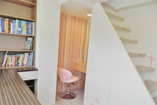 站在这个角度能将这样一间内嵌一样的书房全收眼底,开放式的设计上面是满满的书格,可观的数量能让每本书都分门别类的安置。下面则是一个个的小抽屉,用来收纳也是不错的。