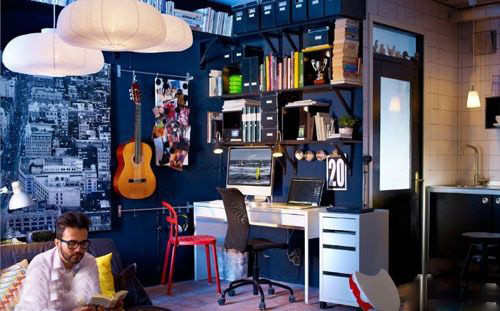 工作室位于客厅一侧的墙角,势必将小空间最大化,主要是墙壁收纳的设计,各种搁架、挂杆、挂钩的设计在这个案例中运用极致。
