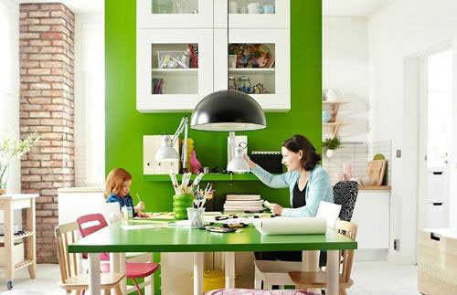 绿色就是那么自然、健康让人放松的颜色,除了隔断墙用绿色油漆粉刷,桌面也特地挑选了绿色款,正对着隔断墙,宽敞的桌面正中央摆放,而足够大的台面足够容纳多人工作学习,同时也是宽敞的餐桌。