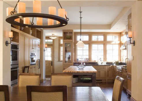 太过简单的餐厅和厨房也许在美观性上比较差,那么不妨根据整个空间的风格和色彩,在吊灯以及餐桌椅的选择上花上一番心思,个性的装饰、物品总能带来不错的体验。