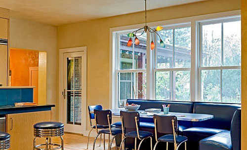 小编的话:橙黄色墙面与蓝色沙发座从颜色上形成对比,暖色调的空间让这一用餐区显出一份温馨感,长形餐桌能够容纳下8个人,顶部的彩色吊灯点缀于餐桌上方,让餐厅有了一种活泼感。