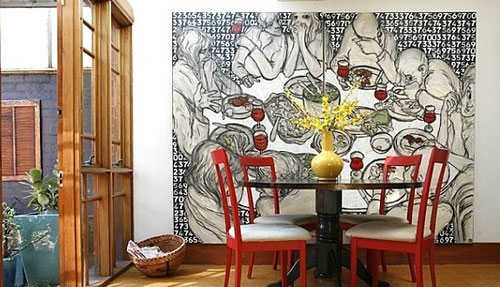 小编的话:在用餐区旁的墙面上用有趣的用餐主题来作为餐厅背景墙,在装饰了这一区域外,还让整个餐厅用餐气氛也有所提升。