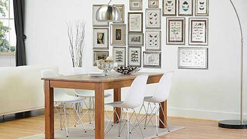 小编的话:原木色地板与简约的矩形木质餐桌营造出了一个能够使人心情平和的用餐环境,墙面上大大小小的画框有序的排列在白色墙面上,使整个空间都充满了丰富趣味。