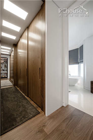 编辑点评:主人套房中更衣室采用了全高的核桃木门,颜色与设计都堪称大气。整个套间的功能齐全,推拉门可以自由开放和封闭。