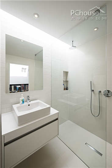 编辑点评:在大户型的房子中通常不止一个浴室。这个客用淋浴房面积不大,而且设计简单,只用了一道玻璃隔断作了干湿分区。虽然面积不大,但保证了实用性。