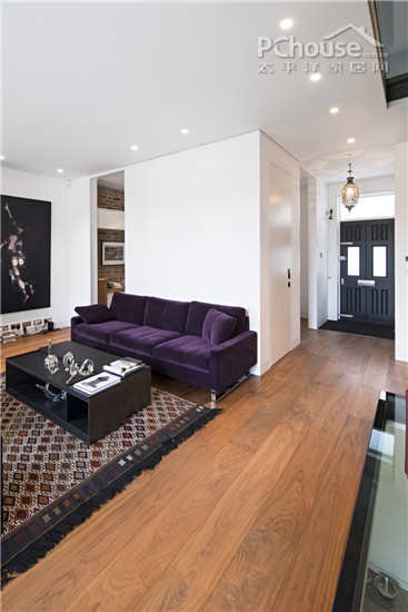 编辑点评:由于书架的存在,房屋中的其他家具便都成为陪衬。低调的深紫色沙发与黑色茶几颜色并不抢眼,也没有豪华的装饰,只为提供舒适的使用效果。家具线条简单,墙壁也四白落地,没有装饰,整个空间低调而简洁。