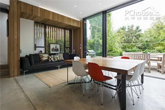 编辑点评:手工打磨的混凝土地面、定制的餐桌、舒适的餐椅,在用餐时也能享受着窗外的美丽景致,这是一个真正低调而奢华的用餐区域。在餐饮区后面是一个舒适的多人沙发,为舒适生活提供了更多可能性。