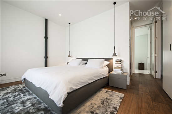 编辑点评:主卧室空间不大,设计简单,房间中没有多余的装饰,能让主人更加专心的入眠。长吊灯型的床头灯节省了床头柜的空间,让主人的睡前读物有了放置之处。