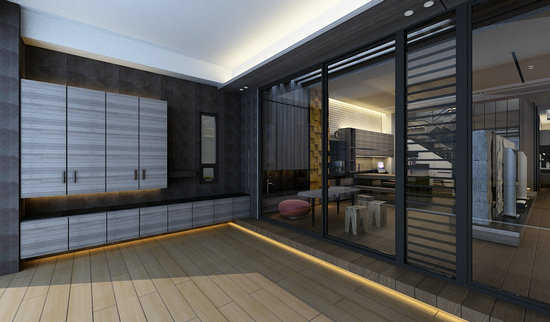 编辑点评:木作隔栅阻挡窗外壁刀煞,并增添穿透感与采光。入门处混搭黑白两色石材定义玄关机能,向内拉伸的白色地坪,也藉此拉长玄关线条呈现大宅入门气势。