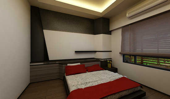 编辑点评:床尾的矮屏风设计遮挡起居室望向卧房的视野,而床头则呼应艺术屏风线条,并有完善收纳空间。