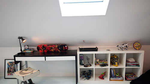 斜顶正下方,用简易小桌跟收纳柜,完成了这一区域的功能整理。打造出小孩子喜欢的学习小天地。