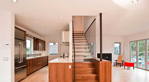 这款楼梯间隔断并不是位于扶手区,而是在楼梯间下方区域。它的设立是为了给自行车的停靠收纳有一个较为独立的空间,差不多与楼梯同宽,简单的设计能让整个区域整洁而不显局促。