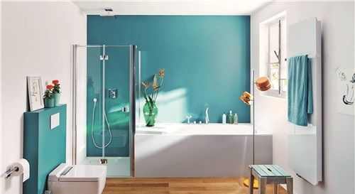 使用彩色防水漆装饰卫浴间墙面,方便日后更换色彩。建议选择饱和度较高的颜色,配饰用对撞色,简单手法,制造出惊艳效果。
