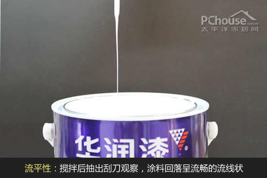 刮刀以顺时针搅拌涂料,浓稠度极好,没有阻滞感,抽出刮刀观察,涂料回落呈漂亮的流线状,流平性表现非常优秀。