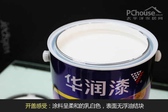华润漆纯境A+纯环保抗污全效内墙漆开盖很容易,打开之后可以看到涂料呈柔和的乳白色,没有明显的乳液结块和不明漂浮物,也没有刺激性的异味。