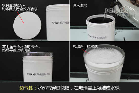 漆膜的透气性关系到墙面的质量和使用寿命。在试验用具的一面涂上华润漆纯境A+纯环保抗污全效内墙漆,待其完全干燥后覆盖在装有沸水的罐子上,盖上玻璃盖。等待5分钟后,可以看到玻璃盖上布满了水珠。由此可看出华润漆纯境A+纯环保抗污全效内墙漆的透气性非常好。