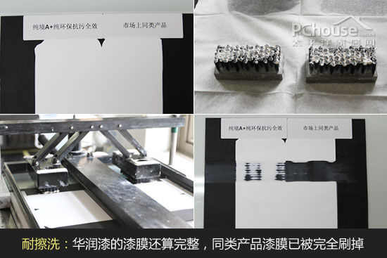 在同一张硬纸板上分别刷上华润漆纯境A+纯环保抗污全效内墙漆和同类产品A,待其干燥后放到专业耐洗刷测试仪器上,用同样的刷子进行耐洗刷实验,观察漆膜损坏情况。