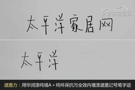 遮盖力是判断涂料性能好坏的重要依据之一。在涂有华润漆纯境A+纯环保抗污全效内墙漆的玻璃板上用记号笔写字,然后刷上一层华润漆纯境A+纯环保抗污全效内墙漆,从覆盖效果来看,字迹覆盖率为100%,就算近距离仔细观察,也看不到原来的字迹。