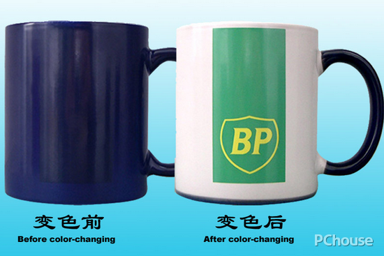 当杯内倒入热水或温水时,杯外有图案的地方将会根据温度变色的杯子,又称盎司彩杯。颜色:内彩9种:粉·红·橙·黄·黑·深蓝·浅蓝·浅绿·绿,;边彩10种,比内彩多一种中蓝。通常采用热转印涂层原料,全自动封闭式无人喷涂车间生产制作。其主要优点是最终成像的色彩还原度高、表面亮度高、表面无浮尘、涂层附着力强和涂层硬度高。另外杯子表面釉孔黑点极少,杯子形体规整度高,杯面很白。杯的材料基本为陶瓷,塑料,炻器乳白釉,或者玻璃。