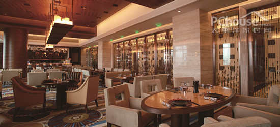 编辑点评:设计师用通透洁净的落地窗迎接前景美色,增加室内采光和便于调节室内温度之余,还实现了用餐区与户外美景无缝隙嫁接的完美设想,让用餐者享受美食的同时,还能尽情欣赏城市的日升月起,繁华喧嚣。