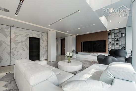 编辑点评:整眼望去,客厅都是几何元素,客厅电视墙利用吊顶灯沟形成的间接光,延伸至墙面开槽通往户外,独立了左侧电视墙的块体。在右侧,设计师利用了黑色不锈钢书架成功地分割挑空区与电视墙的界面。