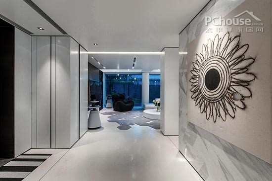 编辑点评:推开虹梅21号大门,简单的葵花装饰画映在爵士白大理石墙体上,对视觉产生温柔的熟悉感,玄关设计的简洁而又细致。