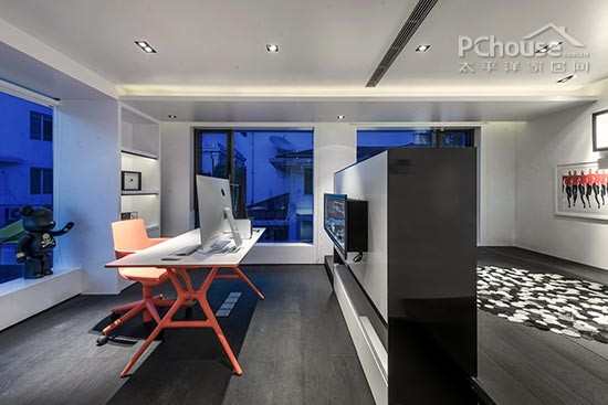 编辑点评:设计师为业主搭配了一套橙色电脑桌和电脑椅,让整个空间生动活泼起来,橙色让人释放压力、产生愉快心情。窗台上的黑色暴力熊给房间增加轻松气息。业主是一名时尚广告创意人,在愉悦的工作环境中,灵感就在某一时刻迸发而出。