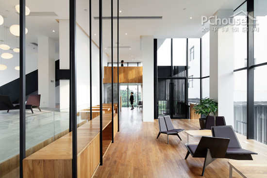 编辑点评:接待区敞开式的空间布局通透明亮,各个界面又以流畅的直线条勾画,让整体空间在阳光的衬托下,更显大气磅礴。黑色的直线线条、座椅与透明的落地玻璃、棕黄色木地板相结合,把舒适的环境汇聚在这个小小天朝,绿意盎然的小盆栽在万籁俱静之际轻轻摇摆,春日里又添一丝新意。
