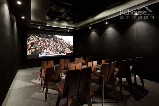 编辑点评:该空间采用隐蔽的照明设计,没有吊灯一类的主光源,而是以隐藏在缝隙间的点光源为主,另外配以内嵌式天花板照明。在相对幽暗的环境中烘托出静谧而平和的氛围,让人摆脱喧嚣的都市,尽情享受影视剧带来的视觉冲击。