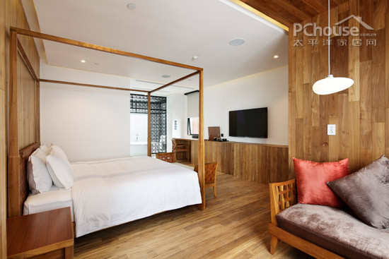 编辑点评:以赏心悦目的木色和白色为基调,清新淡雅的装修风格传达出回归自然、品味生活的淳朴理念。柚木材质的温和朴实肌理,使整体空间简单利落相一致。在卧室也可看到鹅卵石造型的灯饰,那是由日本设计团队Balance Design 为酒店量身设计的装饰。