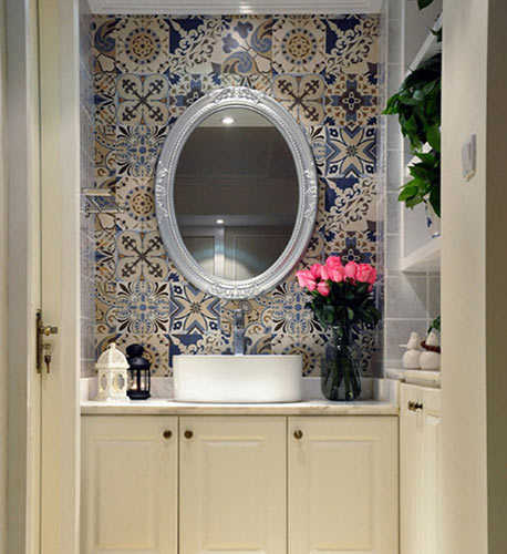 小编的话:最突出的亮点莫过于背景墙的设计。纷繁复杂的图案将摩登与复古的气质融合在一起,提升了整个卫浴间的格调,同时,圆形欧式镜框也是锦上添花。