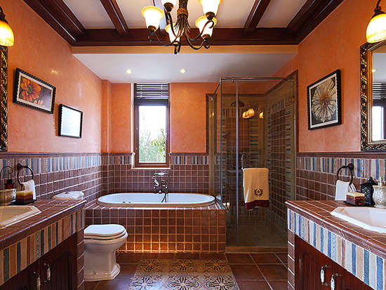 小编的话:墙面和浴缸、面盆使用了较小的方形深棕色瓷砖与条状彩色瓷砖的组合,地面则是较大的深棕色方形瓷砖配以彩色花纹装饰,整个卫浴间透着深沉的古典气质。