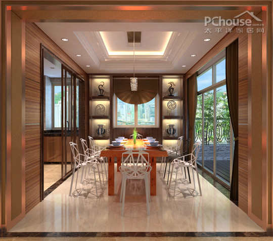 编辑点评:玻璃双开门取代传统的木门设计,打开视觉上的宽敞明亮。穿过玻璃门,木质的墙壁、别致的餐椅、优雅浪漫的内嵌灯光,各种别出心裁的内饰又震荡你的感官,诱引你身处室外桃源的幻想,彰显崇尚自然的设计理念。