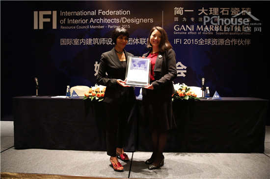 随后,国际室内建筑师设计师团体联盟IFI主席(2009-2014)沙仕·卡安女士对简一大理石瓷砖在设计实践的影响和推动所做出的贡献表示肯定及赞许,愿意与简一大理石瓷砖携手一起,推动中国设计产业的发展。在二十多家媒体的见证下,简一大理石瓷砖国际营销总经理陈梅女士接过由国际室内建筑师设计师团体联盟IFI主席(2009-2014)沙仕·卡安女士授予的认证证书。