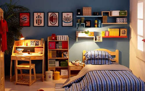 三个靠墙的书架收纳了多种多样的书籍,让孩子处于书籍的海洋之中。木质的书桌台上放上一盏学习的台灯,而台灯利用较高的支架让孩子远离了灯光的直射和散发的热量,为孩子营造出最佳的学习氛围。