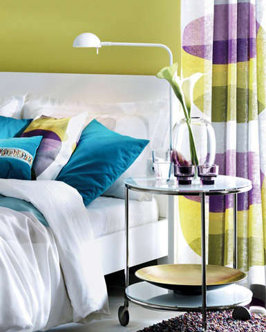 围着床边,白色的床具,白色的床品、黄绿色的墙面,蓝色靠包,成就也卧室空间洁净清新的氛围,带有滚轮的小圆茶几既可以放置插花,也可以放置书籍,功能多样,为睡眠区域增添便利。