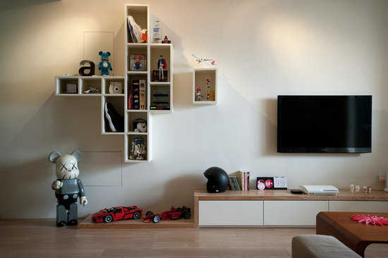 编辑点评:开放式的展示设计总是最能够展现居住者的性格,陈炎腾以此为客厅背墙做出人文刻画。
