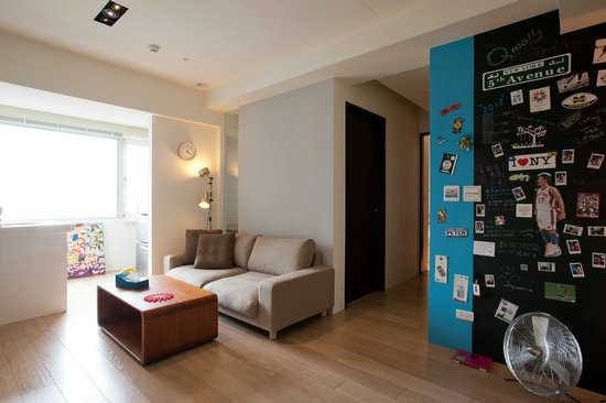进入空间,黑板墙上的涂鸦宣告了屋主性格故事,篮球员简报、过年时朋友来访的留言加上拍立得影像纪录,一点一滴勾勒出了生活轮廓;色彩运用上aspace design将立面处鲜艳的蓝转以浅灰,客厅沙发背墙局部的镂空让客厅与书房采光有了互动,也让一个人的生活多了份自在。