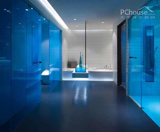 基于此概念,设计师借用丽珀品牌专属的品牌蓝色,结合水和科技感的蓝色光影,贯穿联系整个展厅空间,让观者跟随着这象征智能技术的蓝色光影浏览展厅。空间体验流程是一个先安静神秘到明亮开阔的感官体验:观者从进入展厅开始首先进入是一个光线较暗的品牌水与智能互动的体验大空间,正面对着一栋跨度16米的半悬空的投影幕墙,播放着水千变万化的演变,而听觉感受到的是幕墙后方缓缓下流的自然水帘的真实流水声,顺着从墙体开始的蓝色灯带, 一路经过体感互动技术演绎的未来卫浴空间和模拟产品间进入到明亮开阔的产品展示厅。