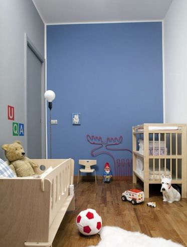 儿童房墙面主要有蓝色和白色,鹿形灯和其他玩具不能少。